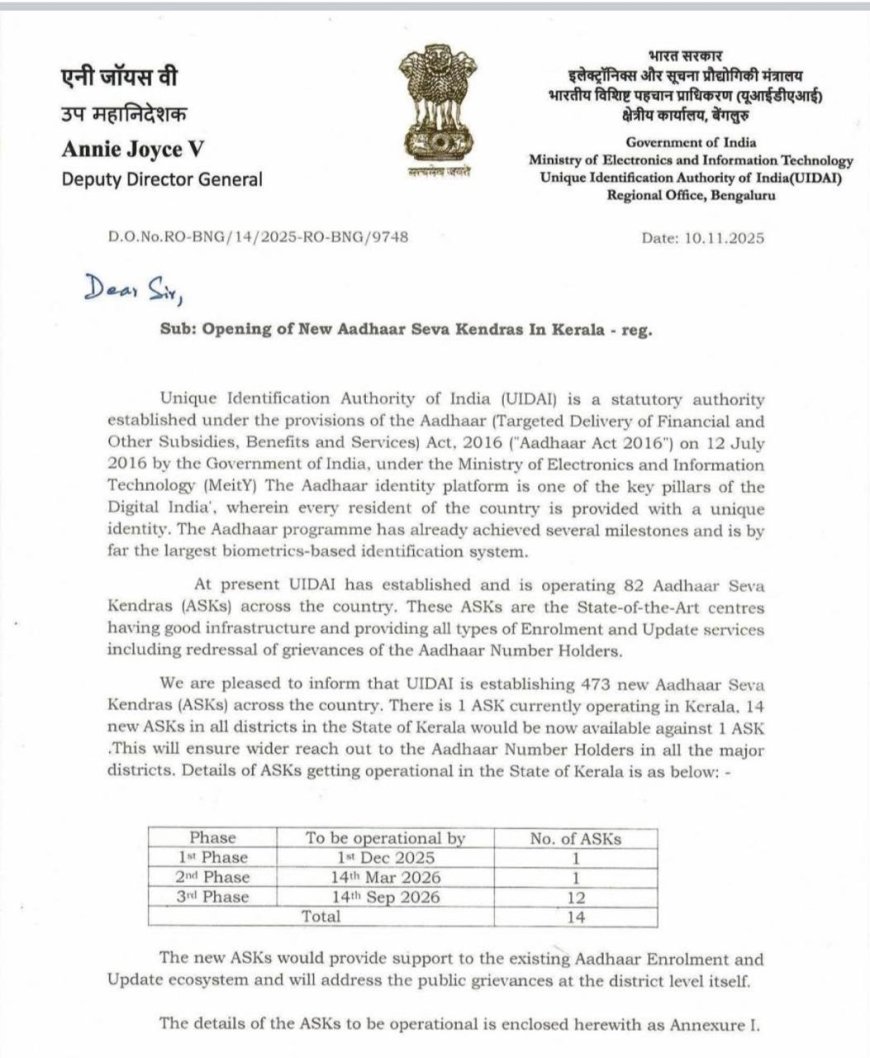 ഈ പുതിയ ASK, 2026 മാർച്ച് 14-ഓടെ തൃശ്ശൂരിൽ പ്രവർത്തനസജ്ജമാകും. ഇത് രണ്ടാം ഘട്ടത്തിൽ (Phase 2) വരുന്ന ഏക കേന്ദ്രമാണ്. പുതിയ കേന്ദ്രം വരുന്നതോടെ, ആധാർ എൻറോൾമെൻ്റ്, അപ്ഡേറ്റ്, പൊതുജനങ്ങളുടെ പരാതി പരിഹാരം തുടങ്ങിയ എല്ലാ സേവനങ്ങളും ജില്ലാ തലത്തിൽ തന്നെ എളുപ്പത്തിൽ ലഭ്യമാകും.