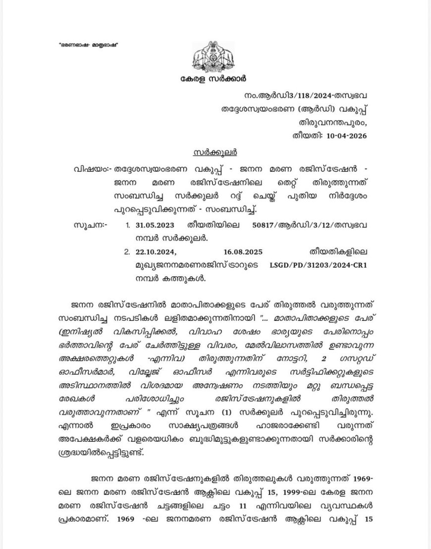 ജനനമരണ രജിസ്ട്രേഷൻ-ജനനമരണ രജിസ്ട്രേഷനിലെ തെറ്റ് തിരുത്തുന്നത് ലളിതമാക്കി ഉത്തരവ്