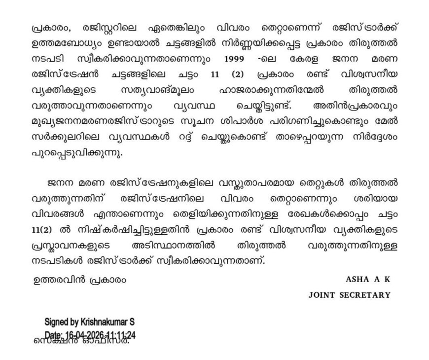 രണ്ട് വിശ്വസനീയ വ്യക്തികളുടെ പ്രസ്താവനകളുടെ അടിസ്ഥാനത്തിൽ ജനന മരണ രജിസ്ട്രേഷൻ വിവരങ്ങളിൽ തിരുത്തൽ വരുത്തുന്നതിന് രജിസ്ട്രാർക്ക് അനുവദിക്കാവന്നതാണ്