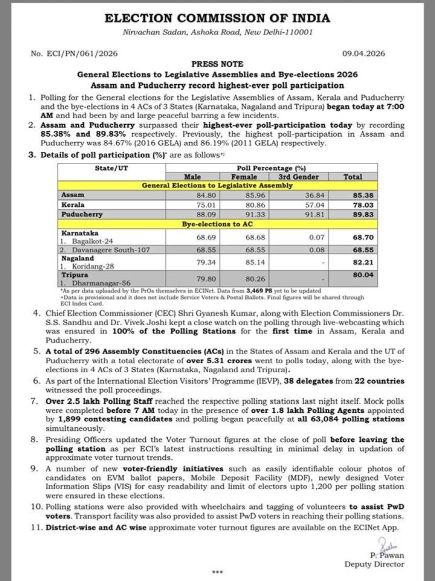 2026 ലെ നിയമസഭാ നിയമസഭകളിലേക്കുള്ള പൊതുതെരഞ്ഞെടുപ്പുകളും ഉപതെരഞ്ഞെടുപ്പുകളുംആസാമിലും പുതുച്ചേരിയിലും ഇതുവരെയുള്ളതിൽ വച്ച് ഏറ്റവും ഉയർന്ന വോട്ടെടുപ്പ് പങ്കാളിത്തം രേഖപ്പെടുത്തി.