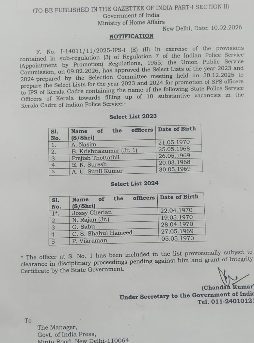 10 കേരളാ കേഡർ എസ് പിമാർക്ക് ഐ പി എസ് സ്ഥാനക്കയറ്റം