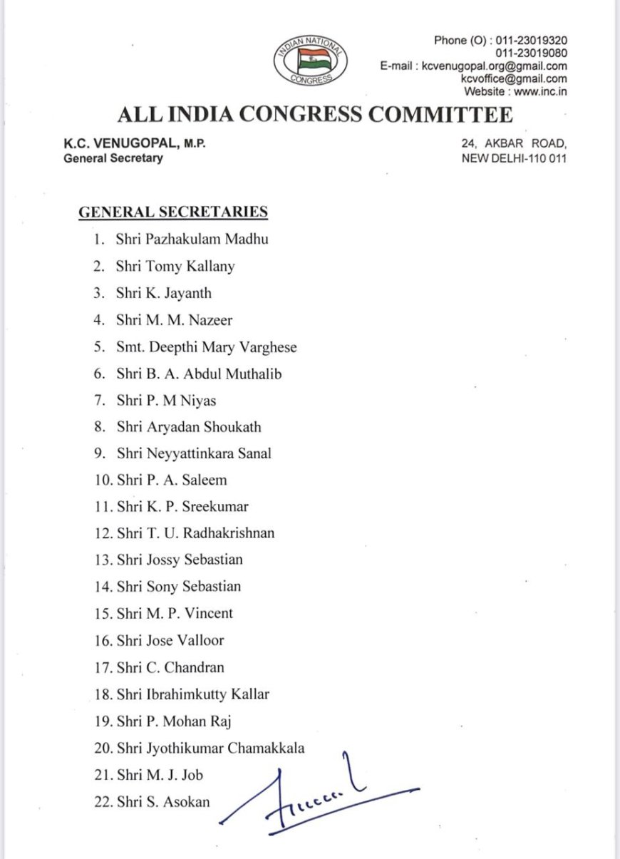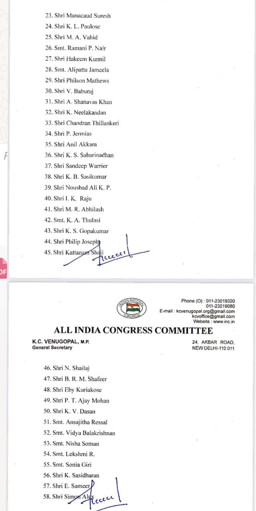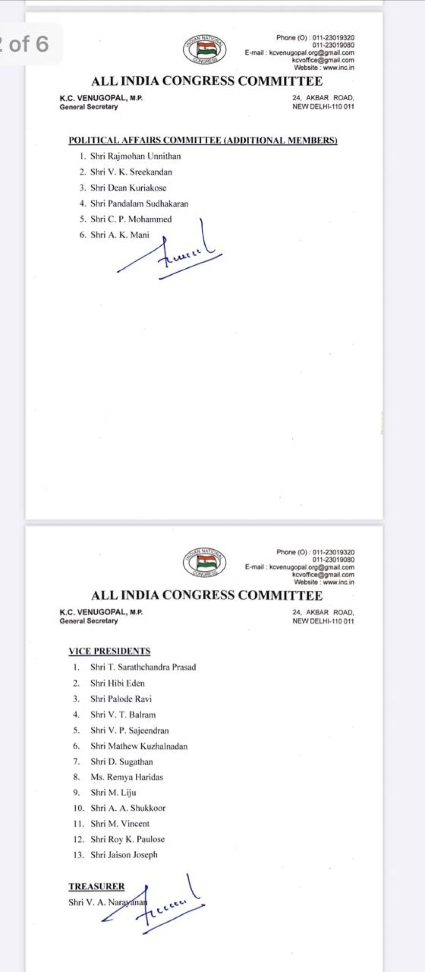 പന്തളം സുധാകരൻ, സി.പി.മുഹമ്മദ്, എ.കെ. മണി എന്നിവരും പുതിയ രാഷ്ട്രീയകാര്യ സമിതി അംഗങ്ങളാണ്. ടി.ശരത്ചന്ദ്ര പ്രസാദ്, ഹൈബി ഈഡൻ, പാലോട് രവി, വി.ടി.ബൽറാം, വി.പി. സജീന്ദ്രൻ, മാത്യു കുഴൽനാടൻ, ഡി. സുഗതൻ, രമ്യ ഹരിദാസ്, എം.ലിജു, എ.എ.ഷുക്കൂർ, എം.വിൻസന്റ്, റോയ് കെ.പൗലോസ്, ജയ്സൺ ജോസഫ് എന്നിവരാണ് വൈസ് പ്രസിഡന്റുമാർ. പാലക്കാട് ഉപതിരഞ്ഞെടുപ്പ് സമയത്ത് ബിജെപി വിട്ട് കോൺഗ്രസിൽ ചേർന്ന സന്ദീപ് വാരിയർ ജനറൽ സെക്രട്ടറിയായി പട്ടികയിൽ ഇടംപിടിച്ചു. കെപിസിസി സെക്രട്ടറിമാരെ പ്രഖ്യാപിക്കാതെയാണ് ഭാരവാഹി പട്ടിക ദേശീയ നേതൃത്വം പുറത്തിറക്കിയിരിക്കുന്നത്.