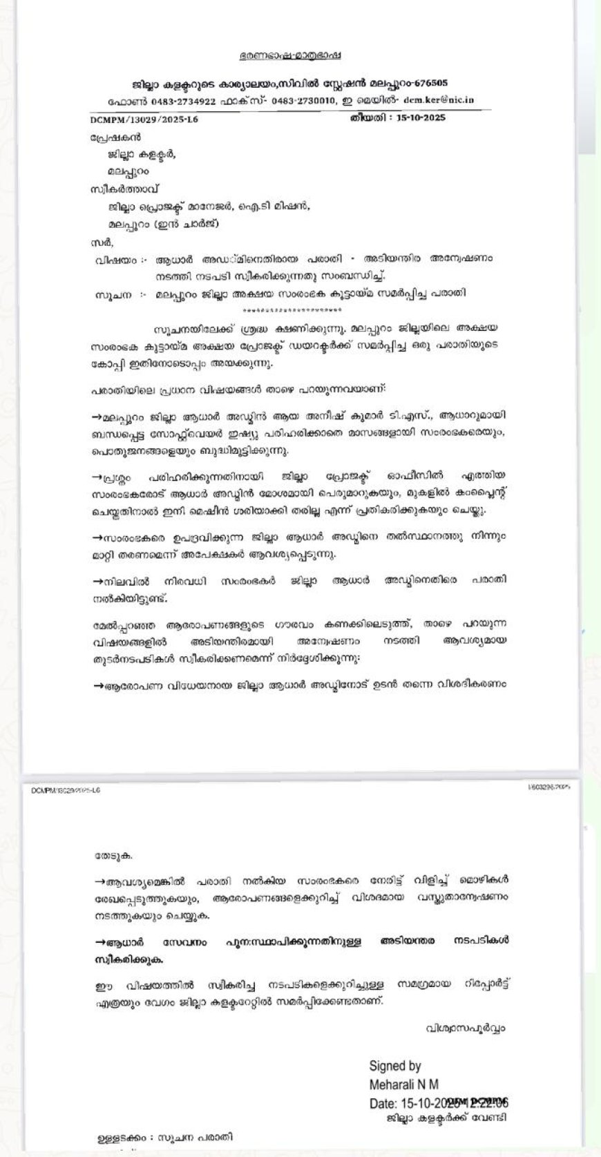 മലപ്പുറം അക്ഷയ ആധാർ അഡ്മിനെതിരെ പരാതിപ്രളയം ,അന്വേഷണത്തിന് ഉത്തരവിട്ട് ജില്ലാ കളക്ടർ