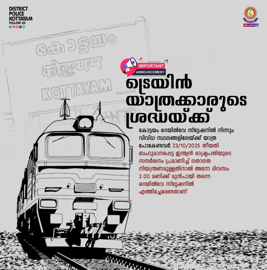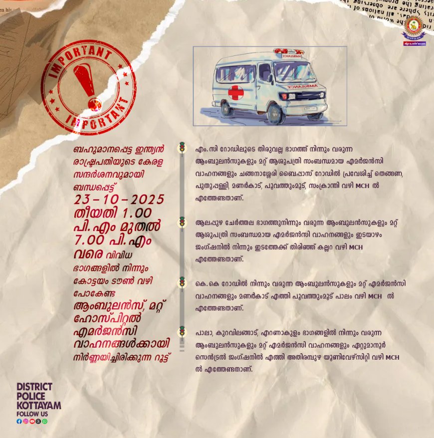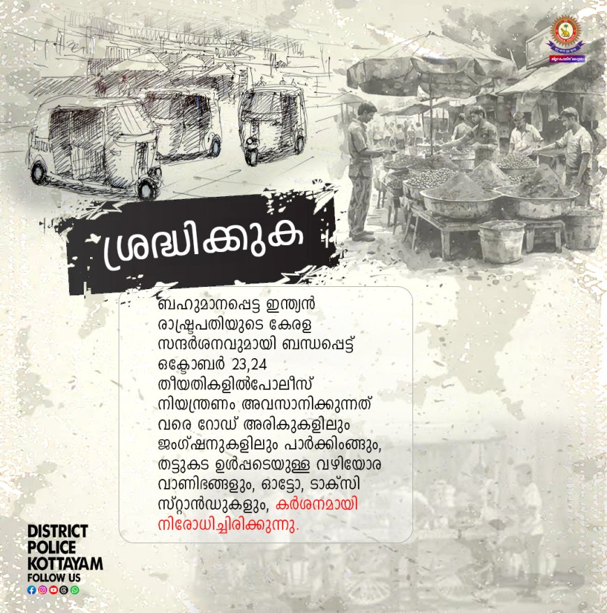 ബഹുമാനപ്പെട്ട ഇന്ത്യൻ രാഷ്ട്രപതിയുടെ കേരള സന്ദർശനവുമായി ബന്ധപ്പെട്ട് 23-10-2025, 24-10-2-25 തീയതികളിലായി കോട്ടയം ജില്ലയില് ഏര്പ്പെടുത്തിയിരിക്കുന്ന ഗതാഗത ക്രമീകരണങ്ങളും മറ്റ് നിയന്ത്രണങ്ങളും